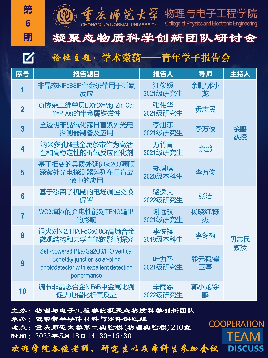 据悉,物电学院各科学创新团队将于近期开展各种形式的科研学术交流活动。本次青年学子报告会展示了物电学院凝聚态物质科学创新团队的学术能力和活力,通过学术交流与研讨,拓展了青年学子学术视野,锻炼了学术总结和报告能力,提升了科研人才培养质量。